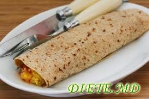 2 albușuri de ou amestecate cu 30 g brânza degresată și 2 linguri de salsa, învelite într-o tortillă de grâu integral.