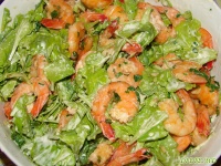 Amestecă într-un castron sucul de lămâie cu cel de pește, uleiul, zahărul brun și ardeiul iute. Adaugă creveții, ardeiul gras, castravetele și ierburile proaspete. Amestecă bine și adaugă compoziția într-un alt castron tapetat cu salată verde.